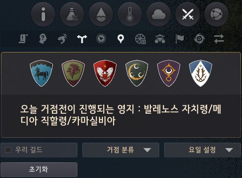 - 각 영지의 시작 거점에 대한 정보는 월드맵(M)에서 거점전 정보를 클릭하면 아이콘을 통해 구별할 수 있습니다.