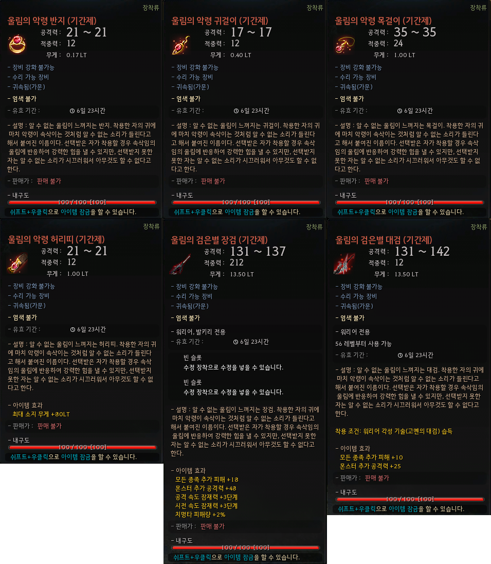 5. 아쿰 방어구 2세트 효과인 모든 회피력 +5 수치가 모든 회피력 +20으로 적용되던 현상이 아이템 설명과 동일하게 적용받도록 수정되었습니다.