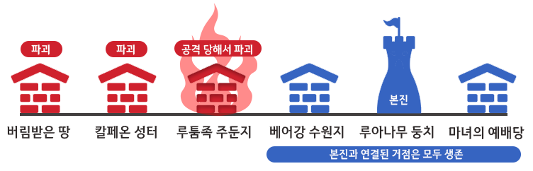 - 3개 이상의 거점을 점령하고 있을 때, 중심 거점과 연결된 거점의 성채가 파괴될 경우 고립된 거점이 모두 해방됩니다.
