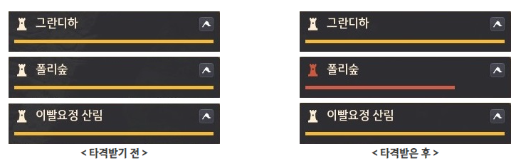 - 타격을 받은 거점의 UI는 붉은색으로 표시됩니다.