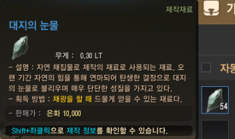 21년 3월 17일 길드 터전 서버와 길드 시추기가 업데이트되었고, 길드 시추기를 제작하는 구성 재료 중 하나인 대지의 눈물이 채광 시 일정 확률로 획득 가능하게 되었어요.