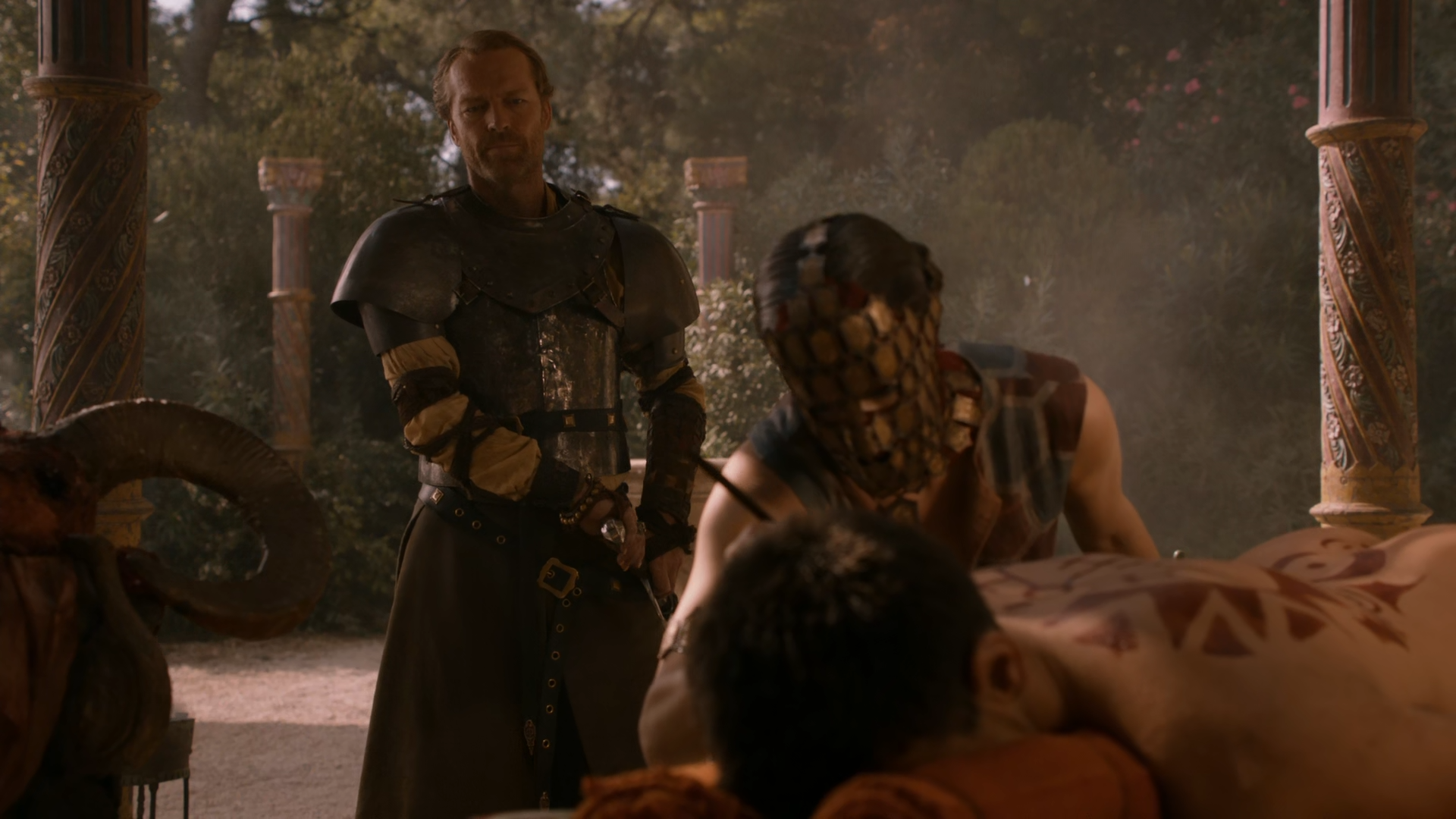 웨스테로스로 가는 배를 구하러 갔던 조라 모르몬트가 돌아온다. 대너리스는 자신을 따르던 자들의 죽음에 자책하고 아무도 믿지 못한다.