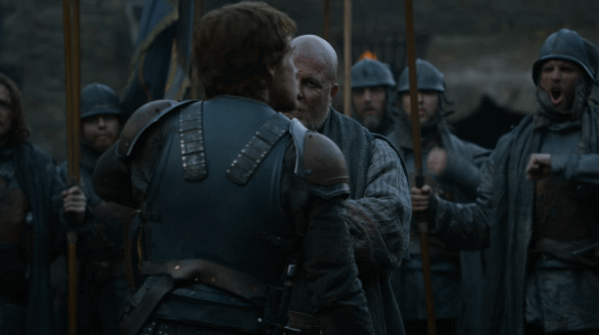 - 테온의 부하들은 테온을 배신하고 안전을 담보로 자신들을 포위한 램지 스노우에게 데려간다. 하지만 램지 스노우는 테온의 부하들을 모두 살해하고, 윈터펠 사람들을 학살한 후 성을 불태우고, 테온의 소행으로 만든다.
