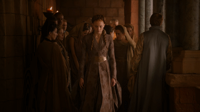 많은 사람들 앞에서 약혼을 파기당한 산사는 뒤돌아 웃음 짓는다. 피터 베일리시는 산사에게 어머니(캐틀린 스타크)를 닮았다며, 집으로 데려다주겠다고 말한다.