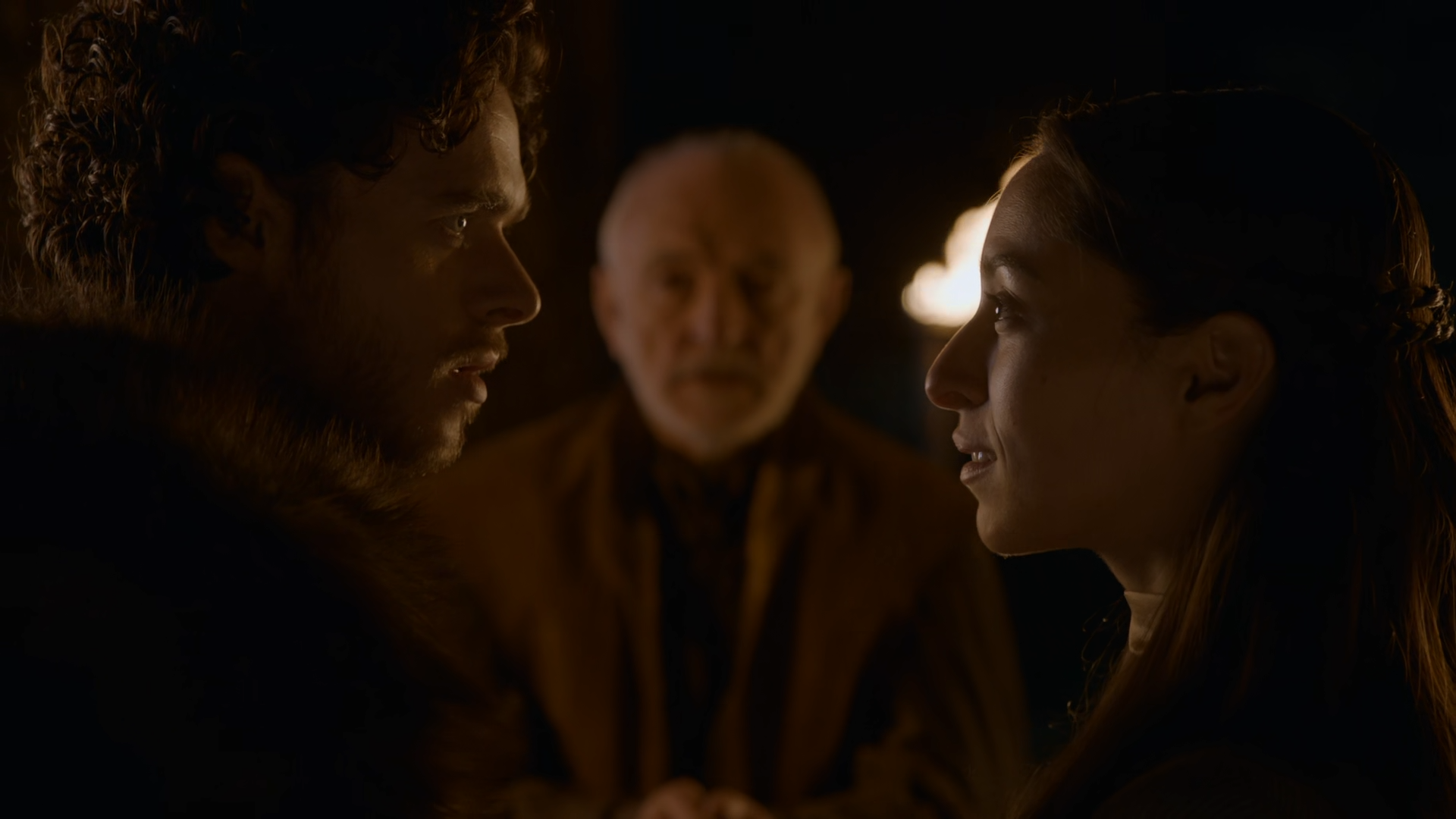 롭은 캐틀린에게 탈리사와 결혼할 의지를 밝히고, 캐틀린은 왈더 프레이와의 약속을 저버린 롭을 비난한다.