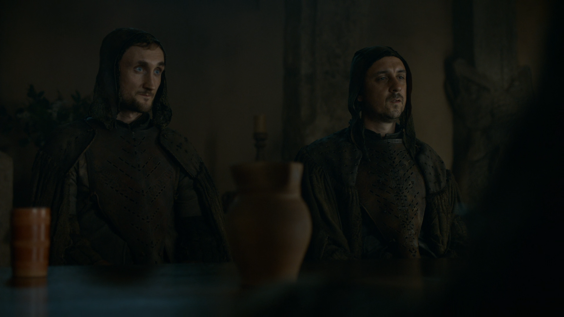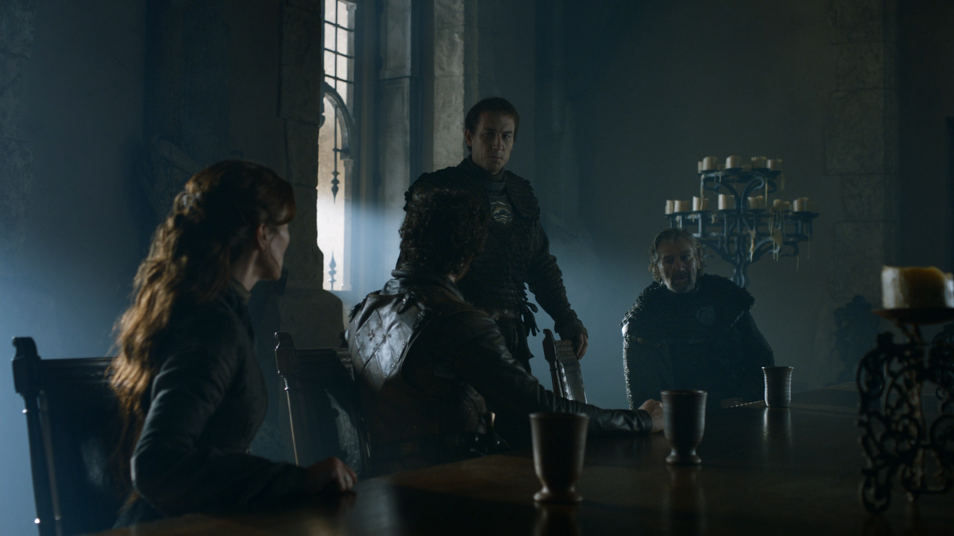 프레이 가에서는 동맹을 유지하는 조건으로, 약혼을 파기한 롭 스타크의 사과와 하렌할 영지를 요구한다. 또 추가로 에드뮤어 툴리와 로슬린 프레이의 혼인을 요구한다. 에드뮤어 툴리는 자신의 이전 실수와 가문을 위해서 어쩔 수 없이 혼인을 받아들인다.