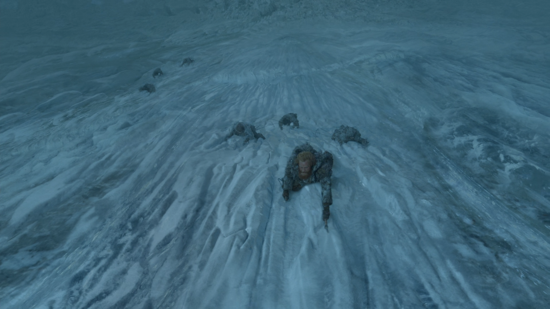 죽을 위험 속에서 토르문드와 오렐, 존 스노우, 이그리트와 야인들은 장벽을 오른다. 마침내 도달한 장벽 위에서 푸른 대지를 바라보며 존과 이그리트는 포옹한다.