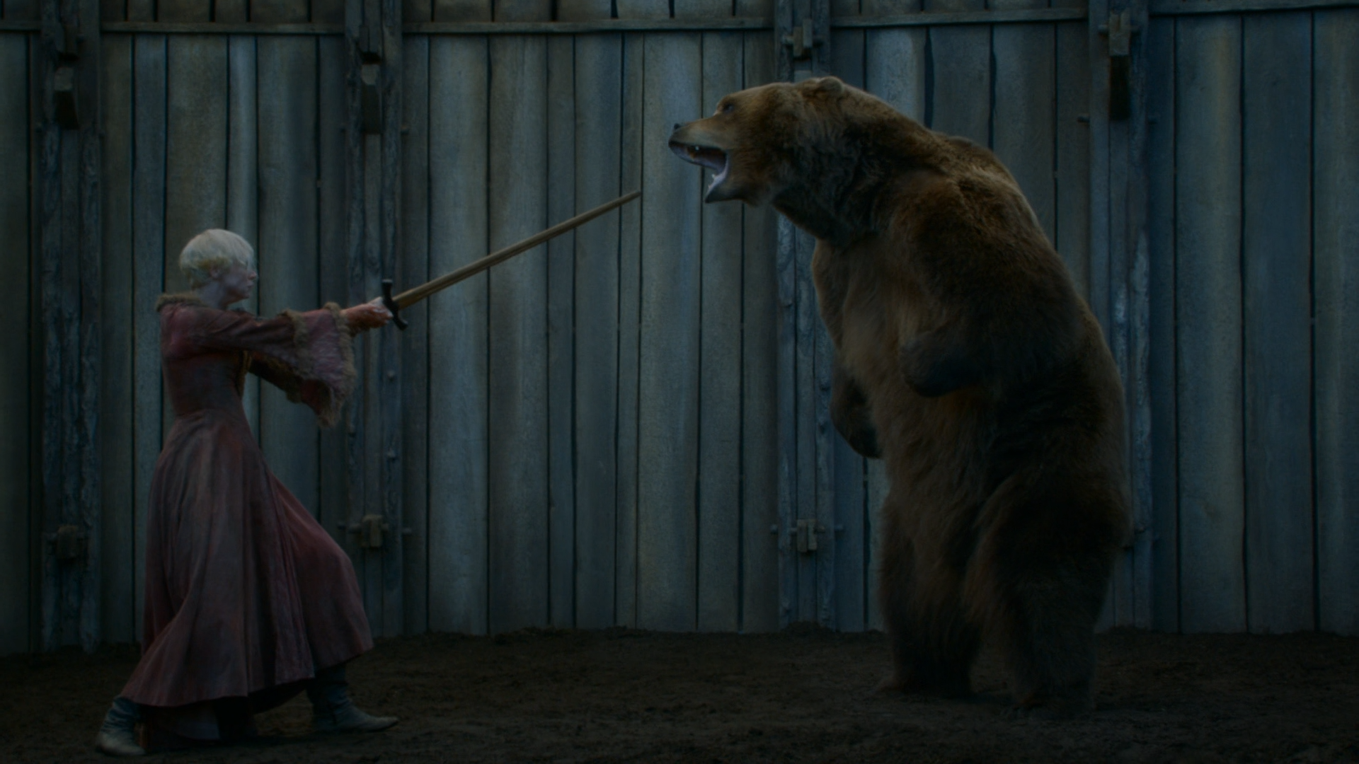 제이미가 하렌할로 되돌아 가서 본 것은 유흥을 위해 곰과 브리엔을 싸우게 하는 것이었다. 로크는 브리엔을 꺼내 달라는 제이미의 요구를 거절하고, 제이미는 직접 곰 우리로 뛰어든다. 제이미와 그의 안전을 지켜야 하는 루즈 볼튼 부하들의 도움으로 브리엔은 살아난다.