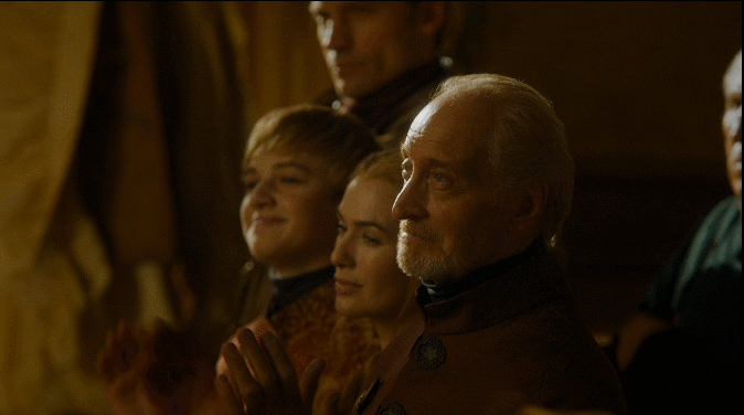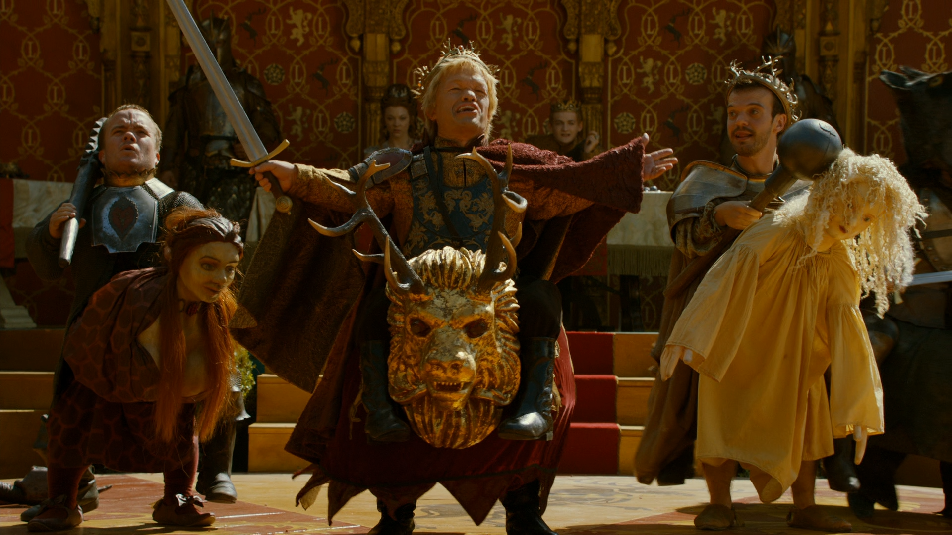 타이윈 라니스터와 세르세이 라니스터, 오베린 마르텔, 엘라리아 샌드가 미묘한 언쟁 중일 때, 조프리 바라테온은 왜소증 광대들을 동원해 다섯 왕의 전쟁을 조롱한다.