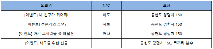 아기 코끼리를 키우고 싶은 헤로의 부탁을 들어주는 가문당 1회 수행 가능한 연속 의뢰예요. 4개의 연속 의뢰를 완료하려면 도전 과제와 채집/낚시/사냥으로 얻을 수 있는 축제의 흔적이 50개 필요해요.