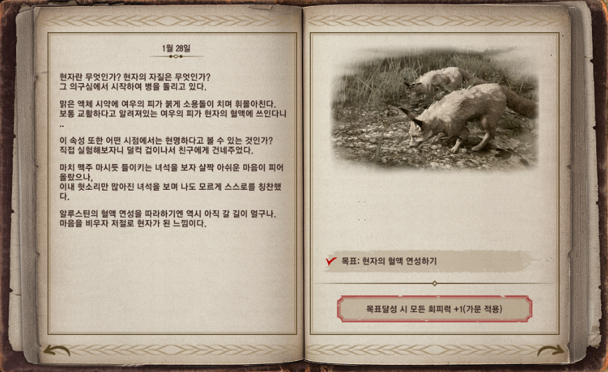 현자의 혈액 - 맑은 액체 시약1, 여우(족제비/너구리/원숭이) 피2, 비상의 흔적1, 수도사의 가지1