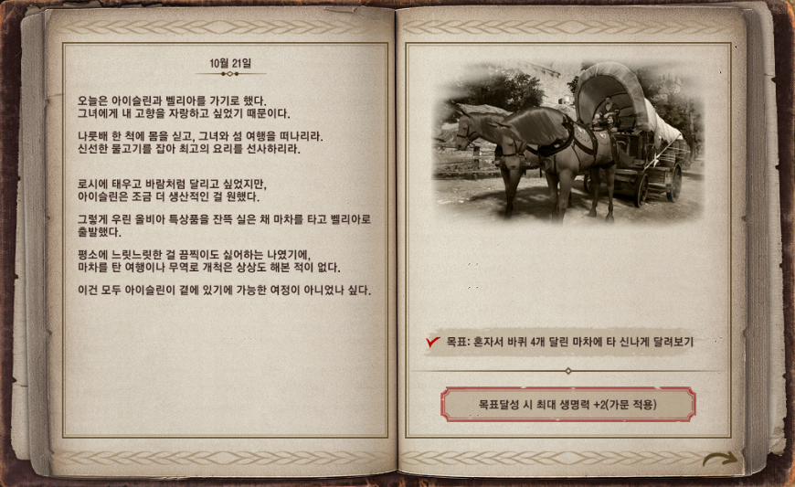 1. 혼자서 바퀴 4개 달린 마차에 타 신나게 달려보기 - 농장 마차, 귀족 마차, 상단 마차 등에 타서 조금만 움직이면 완료예요.