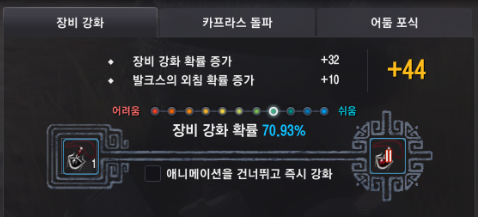 강화 확률은 44 스택에서 71% 정도 나오네요.