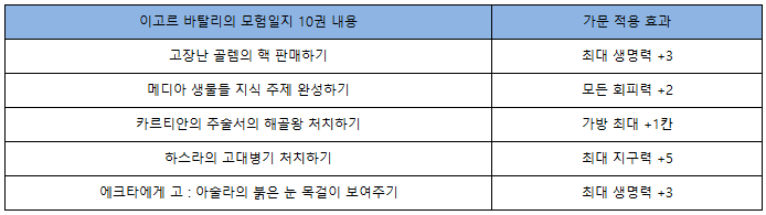 이고르 바탈리의 모험일지의 여러 항목들을 완료하고 가문 내 모든 캐릭터들이 적용받을 수 있는 최대 생명력, 최대 지구력, 모든 적중력, 모든 회피력, 모든 공격력, 모든 방어력, 최대 소지 무게, 가방 최대 칸수 증가 효과를 얻을 수 있어요.