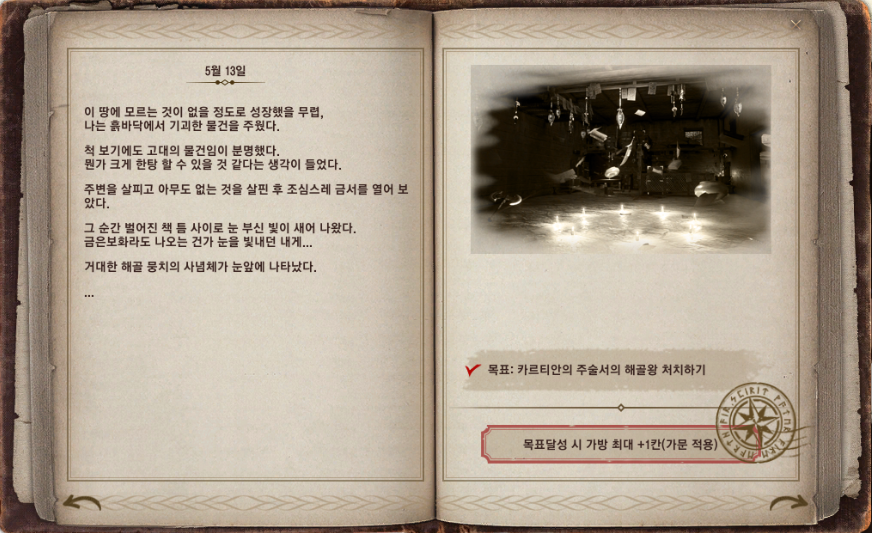 3. 카르티안의 주술서의 해골왕 처치하기 - 금기의 서 5장을 배열해서 카르티안의 주술서를 조합할 수 있어요.