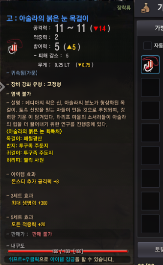 고 : 아술라의 붉은 눈 목걸이를 타리프 마을의 <여관 주인> 에크타에게 가져가서 보여주면 완료예요. 의뢰를 완료해도 아이템은 사라지지 않아요.