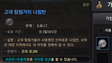 '탐험가의 나침반 부품' 3개를 조합해 기간 제한인 '고대 탐험가의 나침반' 을 만들어 사막에서 위치를 확인할 수 있고, 환상마 디네를 이용하면 수월하다고 해요. 디네가 없다면 빠른발걸음 스킬을 배운 낙타를 이용해도 좋다고 하고요.