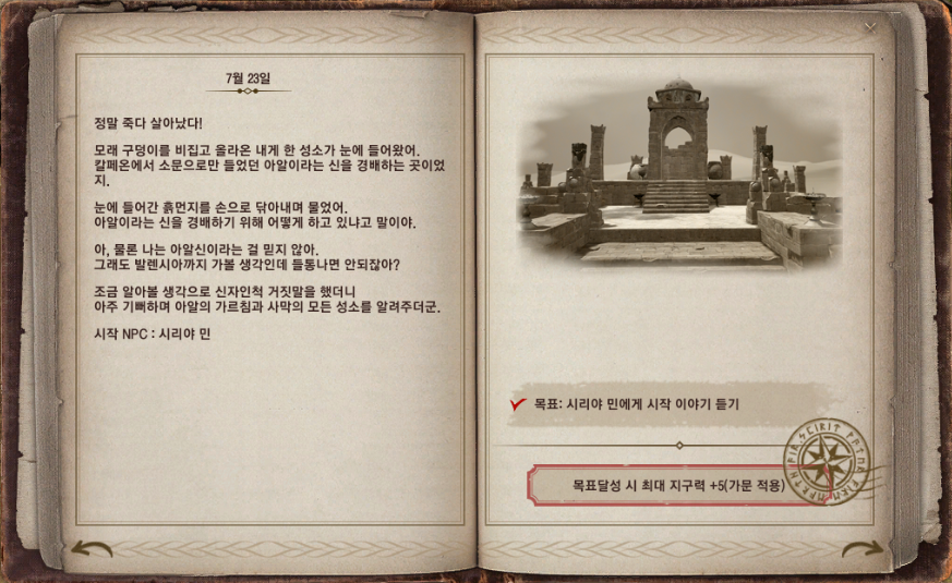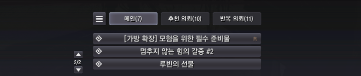 3. [시간제한] 순례자의 길 - 순례자의 성소 순종의 <탐험 거점 관리> 시리야 민으로 부터 시작하는 의뢰예요. 12분 안에 순례자의 성소 - 절제, 성실, 겸손, 순결, 분배, 금식을 방문하고 순례자의 성소 금식의 <탐험 거점 관리> 레미 타라와 대화해야 해요.