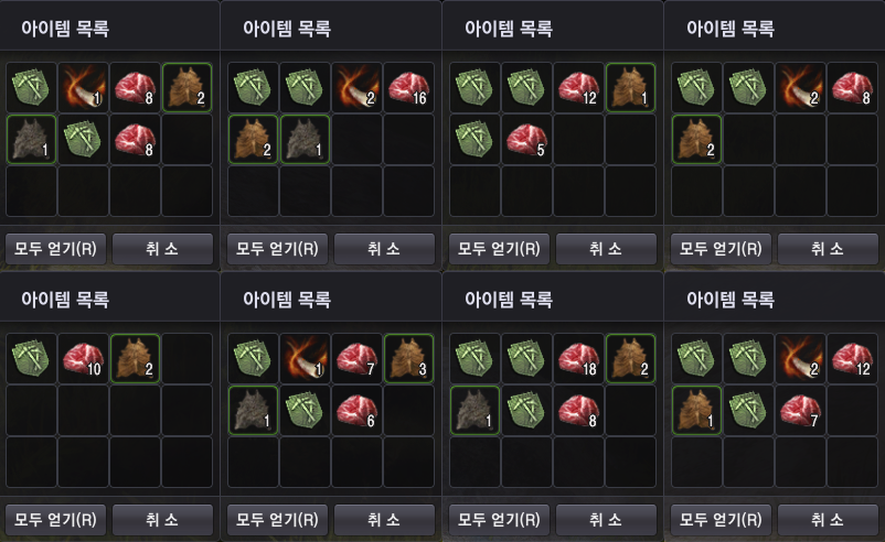 4. 장인의 박제 수집(3종류) - 거래소에서 구입할 수 있다면 가장 좋은 선택이 될 거 같아요. 기본적으로 상처 난 가죽이 거래가 불가능한 수렵 채취 아이템이기 때문에, 박제 완제를 구매하지 못하면 직접 만들어야 하는데, 드랍률을 그리 좋지는 않은 편이에요.