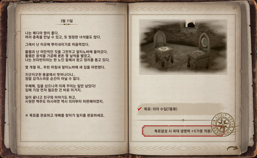 1. 의자 수집(7종류) - 각 마을의 가구 상인에게서 친밀도로 구입할 수 있는 것들과 각 마을 가구 공방에서 생산할 수 있는 것들 그리고 칼페온 가구 상인이 파는 것들 중에서 7종류를 가져가면 완료할 수 있어요.