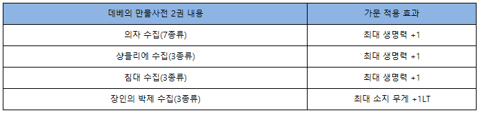 데베의 만물사전의 여러 항목들을 완료하고 가문 내 모든 캐릭터들이 적용받을 수 있는 최대 생명력, 최대 소지 무게 증가 효과를 얻을 수 있어요.