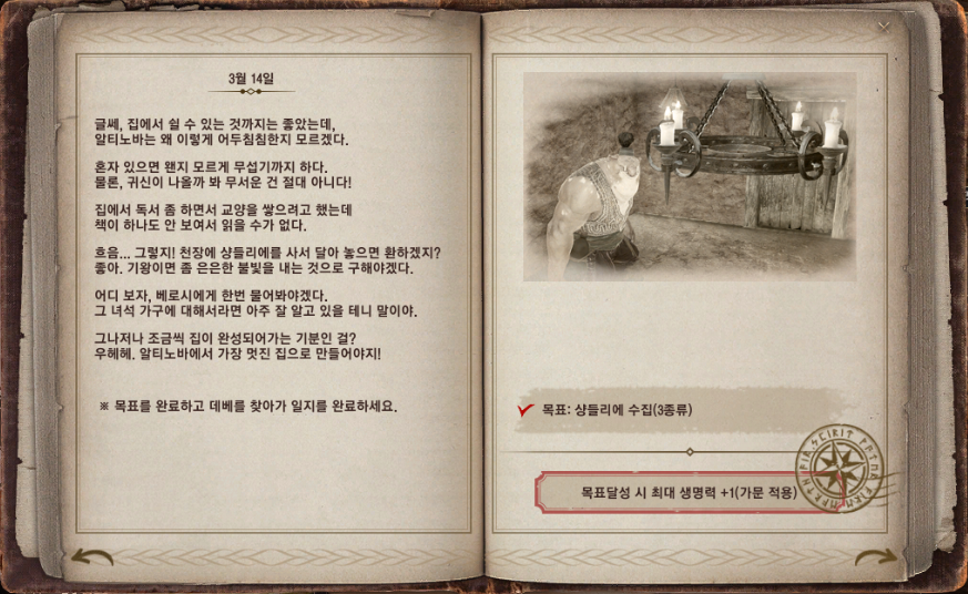 2. 샹들리에 수집(3종류) - 각 마을의 3단계 가구 공방에서 샹들리에를 제작할 수 있긴 하지만, 칼페온의 <촛대상인> 안나벨라 벨루치가 6종류의 샹들리에를 저렴하게 판매하고 있어요.