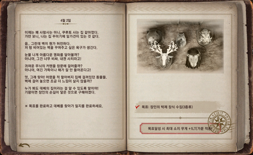 가장 수량이 적게 들어가는 곰 머리, 여우 머리, 늑대 머리, 거대 멧돼지 머리, 큰뿔사슴 머리를 이용하면 상처 난 가죽이 적게 필요한데, 따로 시간을 내어서 여우 머리, 늑대 머리를 구하는 것보다 거대 불곰을 잡는 게 나을 듯해서, 거래소에서 쉽게 구매할 수 있는 박제들로 장인의 머리 박제를 만들었어요.