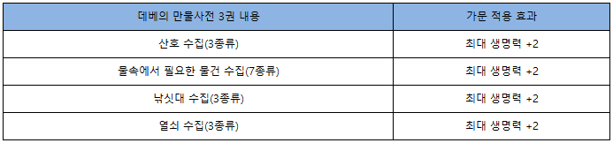 데베의 만물사전의 여러 항목들을 완료하고 가문 내 모든 캐릭터들이 적용받을 수 있는 최대 생명력, 최대 소지 무게 증가 효과를 얻을 수 있어요.