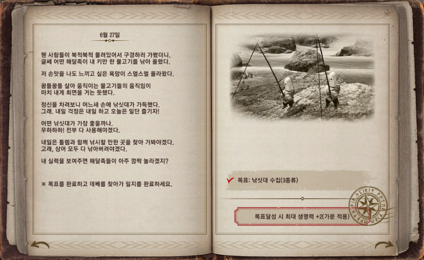 3. 낚싯대 수집(3종류) - NPC에게 구입할 수 있는 낚싯대와 제작 낚싯대, 세찌 낚싯대 중 3종류를 데베에게 가지고 가면 완료할 수 있어요. 강화된 낚싯대들은 불가능 하다고 해요.