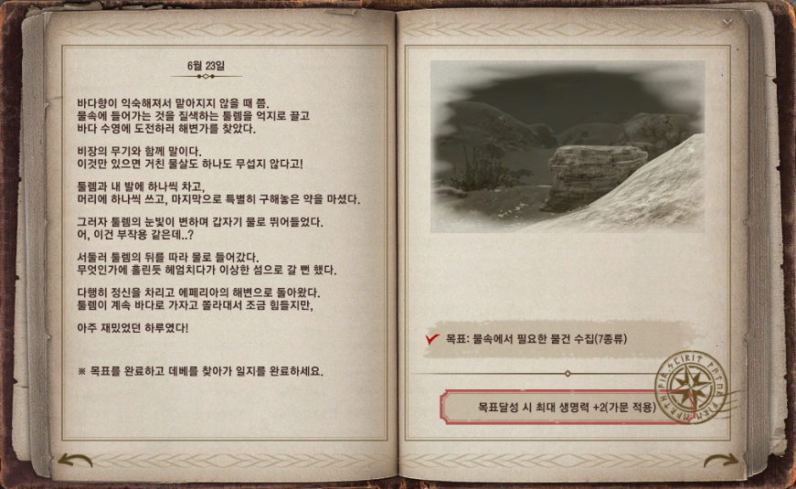 2. 물속에서 필요한 물건 수집(7종류) - 발렌시아의 사막 나가와 글리시 주변의 포건, 나가에게서 얻을 수 있는 잡템 3종류와 비약 그리고 파티 비약, 랏항구 의뢰로 얻을 수 있는 바다빈 물안경, 하이델 7-4번지 2층에 있는 의상 제작소 2단계에서 제작할 수 있는 뻐끔뻐끔 물안경 중 7종류를 가지고 데베에게 가면 완료할 수 있어요.