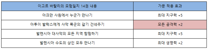 이고르 바탈리의 모험일지의 여러 항목들을 완료하고 가문 내 모든 캐릭터들이 적용받을 수 있는 최대 생명력, 최대 지구력, 모든 적중력, 모든 회피력, 모든 공격력, 모든 방어력, 최대 소지 무게, 가방 최대 칸수 증가 효과를 얻을 수 있어요.