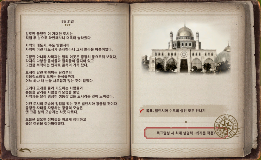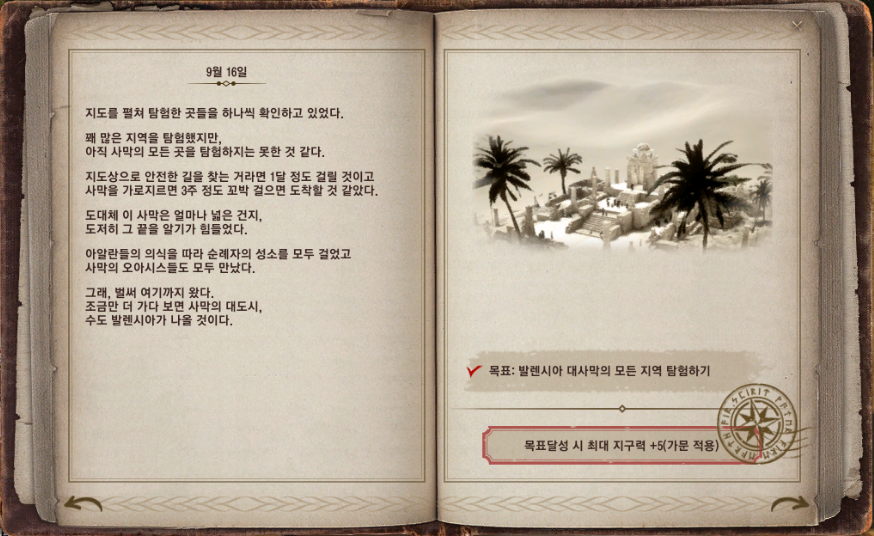 지식(H) 탭 - 지형 - 발렌시아 - 발렌시아(대사막) 내에 있는 21개 항목을 완성해야 하는데요. 대부분 해당 지역을 발견하는 것으로 지식을 얻을 수 있지만 아크만 사원, 축복의 오아시스, 시간의 오아시스, 꿈꾸는 오아시스는 지식을 주는 NPC와 기운을 소모해 대화하고 얻을 수 있어요.