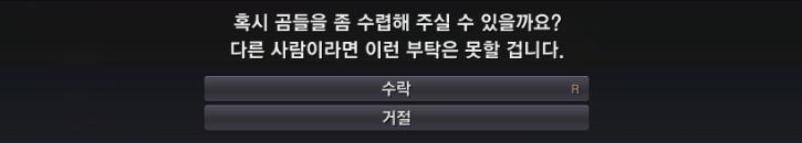 의뢰서와는 별도로 우두머리 대왕 불곰을 소환할 수 있는 아이템이 필요한데, 사슴(여우)고기10, 새 고기10, 은은한 향이 나는 비약(NPC 재료상인)1 재료를 간이 연금하면 '우두머리 대왕 불곰 유인용 덫' 을 제작할 수 있어요.
