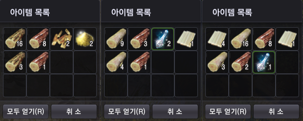 - 통나무(800), 전나무 원목(1,350), 삼나무 원목(900), 소나무 원목(800), 짙푸른 발굽뿌리(2,500,000), 레이라의 꽃잎(500,000), 검은 결정 파편(450,000), [길드] 아푸아루의 훼손된 지도 조각(1,000,000), 요정의 가루(10,000), 카프라스의 돌(2,550,000), 고대 정령의 가루(475,000), 뾰족한 흑결정 조각(3,200,000), 단단한 흑결정 조각(1,060,000) 기준