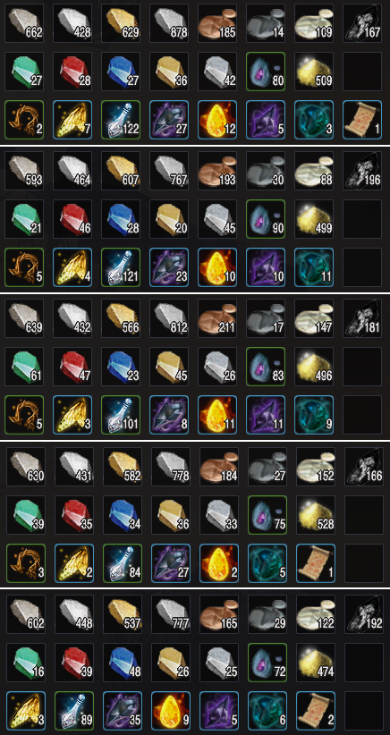 - 구리 광석(300), 아연 광석(1,900), 거친 석재(1,200), 철 광석(500), 백금 광석(6,000), 금 광석(5,000), 은 광석(4,000), 짙푸른 발굽뿌리(2,500,000), 레이라의 꽃잎(500,000), 검은 결정 파편(450,000), [길드] 아푸아루의 훼손된 지도 조각(1,000,000), 요정의 가루(10,000), 카프라스의 돌(2,550,000), 고대 정령의 가루(475,000), 뾰족한 흑결정 조각(3,200,000), 단단한 흑결정 조각(1,060,000) 기준