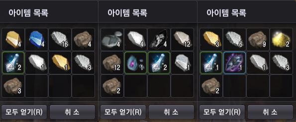 벌목과 마찬가지로 흑결정 조각의 수에 따라 수익의 편차가 좀 있는 편이고, 기본 광물과 함께 100개 내외의 고대 정령의 가루를 고정적으로 얻을 수 있기 때문에 고대 정령 가루5 + 블랙스톤 무기(방어구)1 = 카프라스의 돌을 통해 수익을 얻을 수 있어요.