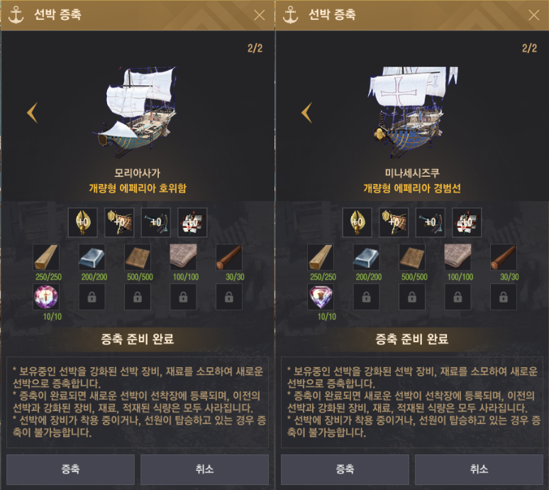재료를 인벤토리에 소지하고 <나루터지기> 의 선박 메뉴 중 '선박 증축'을 통해 바로 증축이 가능해요.