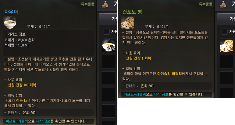 4. 재료 때문에 차우더의 제작 난이도가 쉽지 않은 편인데, 차우더를 대체할 건포도 빵이 패치되었어요. 벨리아 마을 아이슬린 바탈리에게서 개당 1만 은화에 구입할 수 있고 개당 선원 건강 1을 회복할 수 있어요. 기존의 차우더는 선원 건강 10 회복에서 수치가 상승해 선원 건강 100 회복의 수치를 가지게 되었어요.