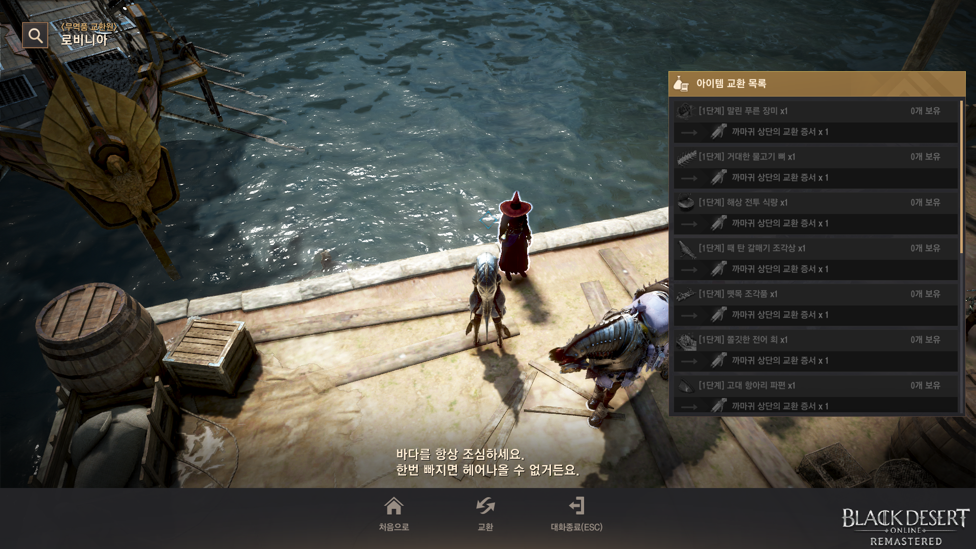 2. 에페리아와 벨리아 선착장에 라비니아의 자매인 루비니아와 로비니아 추가되었어요. 교환품을 들고 까마귀 둥지로 라비니아를 찾아가는 대신에 루비니아와 로비니아를 통해서 1차 무역품을 신록을 머금은 블랙스톤을 획득할 수 있는 까마귀 상단 교환 증서로 교환할 수 있어요.