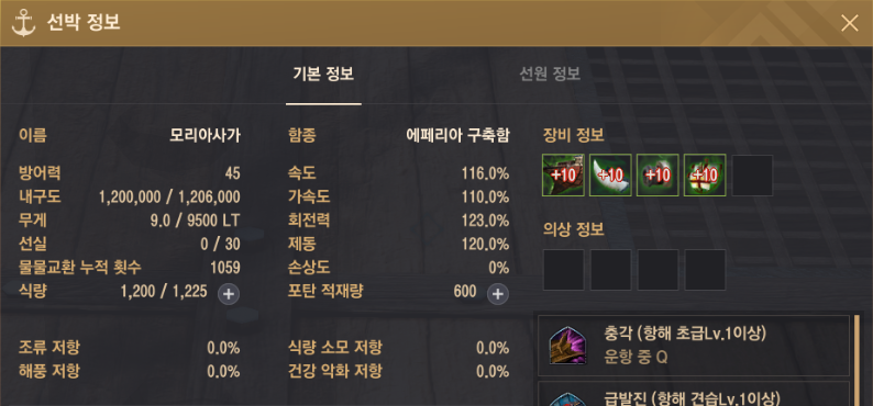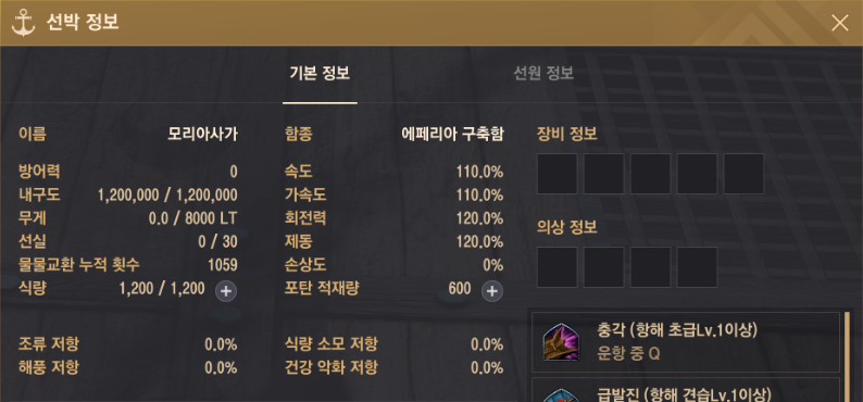 증축 전과 후의 차이가 있긴한데, 일단 선박의 능력치에서 전부에 가까운 비중을 차지하던 속도는 녹색 등급 장비 10강 4개를 착용하더라도 파란색 등급의 호위선 장비보다 낮아요. 선원 고용 공간이 30으로 늘어나 <욕심있는> 고블린 선원을 3명 승선시킬 수 있기는 하지만, 수치상으로 낮은 건 어쩔 수 없고요.