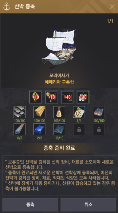 [검은사막] 대양의 시대 - 에페리아 구축함 증축 선박 비교, 증축 재료