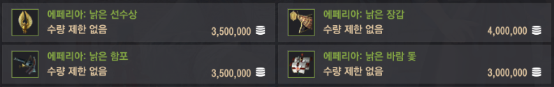 | +10 에페리아 : 낡은 선수상 1 | 팔라시에게 구매 후 강화 |
