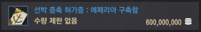 1. 에페리아 항구의 필라베르토 팔라시에게 '선박 증축 허가증 : 에페리아 무역선' 을 6억 은화에 구매해요.