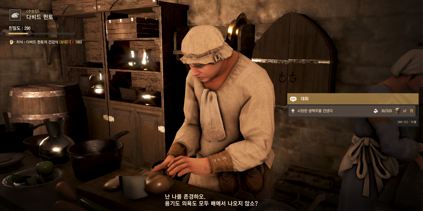 - 벨리아 마을 <주방장> 다비드 핀토와의 대화에서 시원한 생맥주 1개와 기운 30이 필요해요.